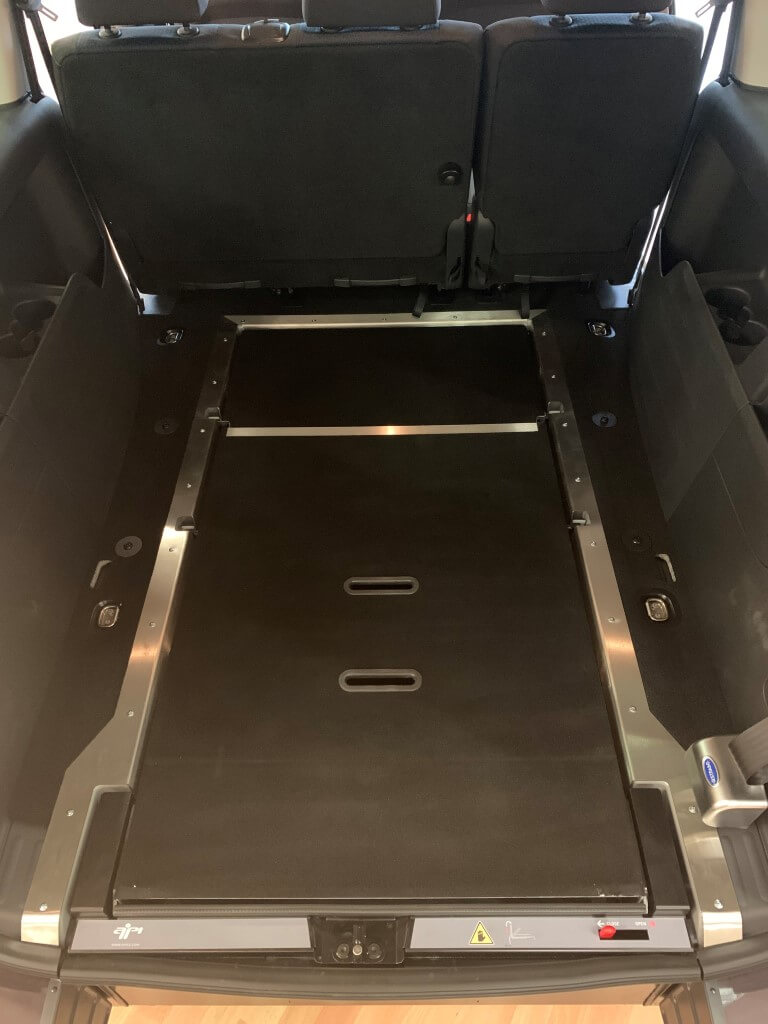 The vehicle is equipped with our new foldable ramp allowing the user to have available the full-size luggage compartment without any obstructions, or easily unfold the ramp and create space for the wheelchair. There is a wheelchair restraint system fitted inside of the car for secure transport of the disabled person.